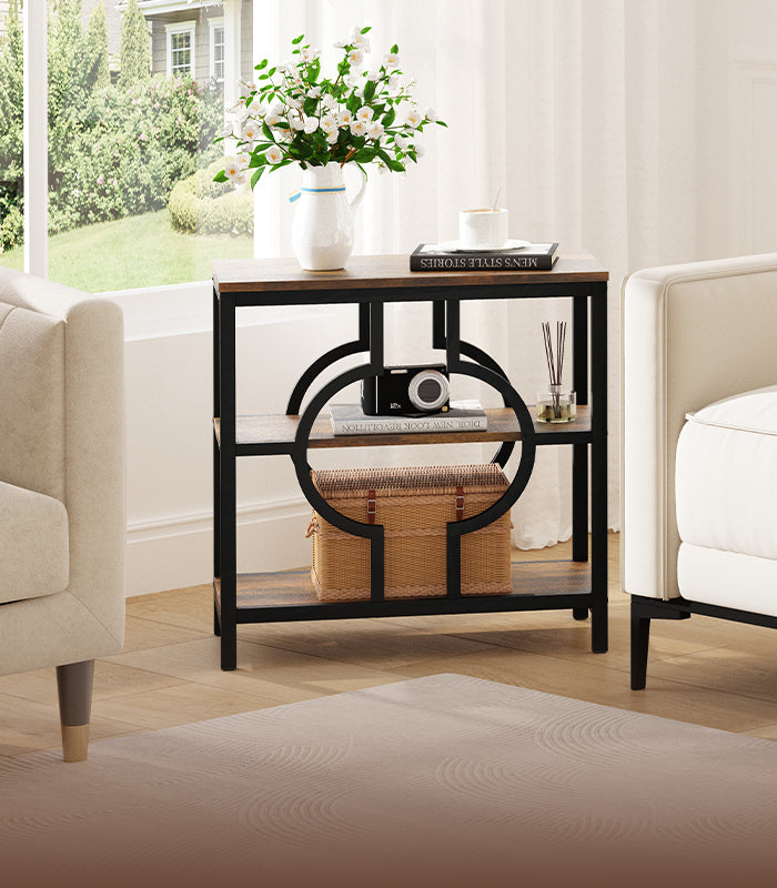 Vendor:vividwoodVividwood 55" Industrial Sofa Table - 3-Tier Storage Console with Geometric Design (Rustic Brown)
