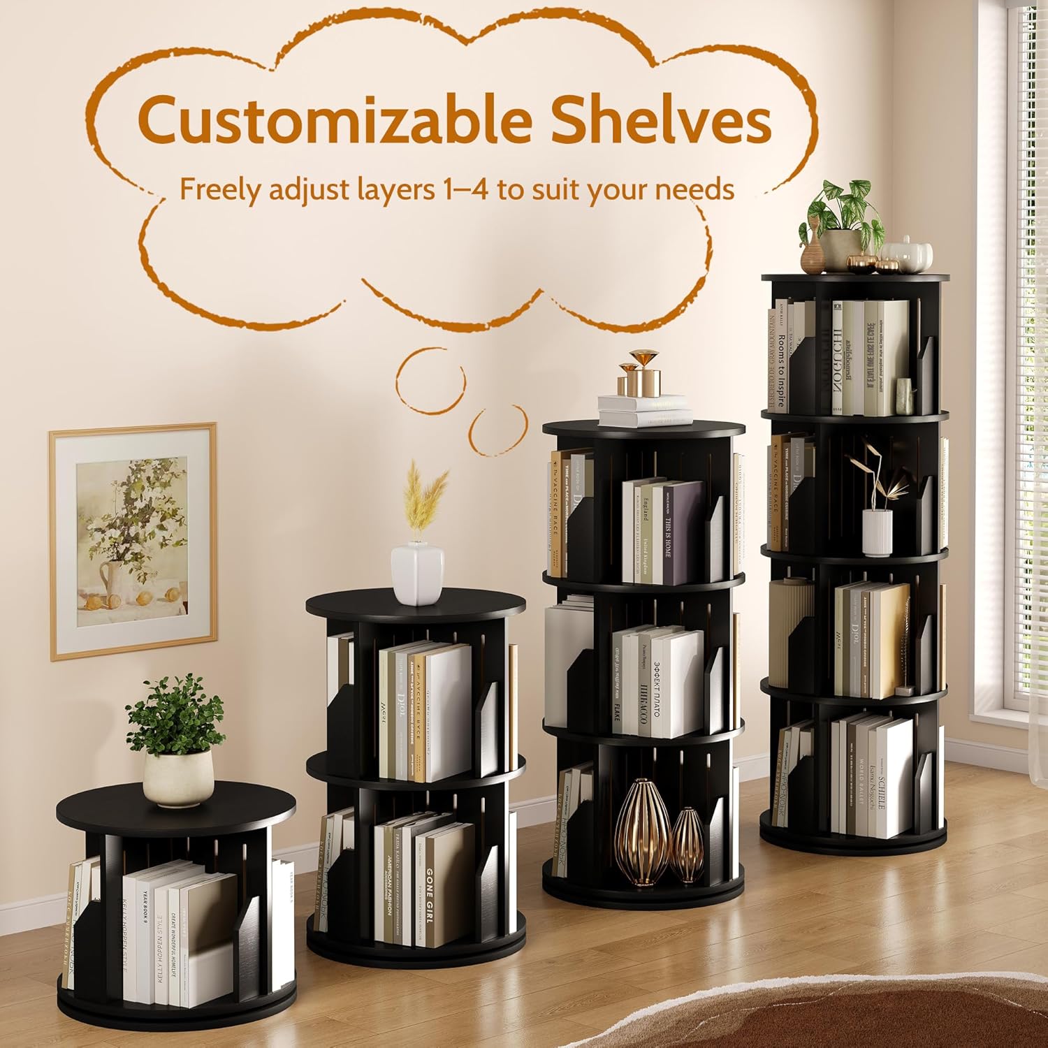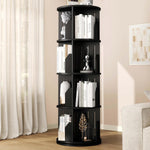 [Large Capacity & Smart Design] This vertical swivel lazy susan organizer features 4 spacious tiers plus an open top shelf—offering plenty of room to display and organize your favourite books, photo albums, plants, and decorative items. Each tier includes 4 cubbies, making it easy to sort your collection and keep things tidy. With space to hold 80–100 medium-sized books, it turns any room into a mini personal library—stylish, functional, and full of character.
