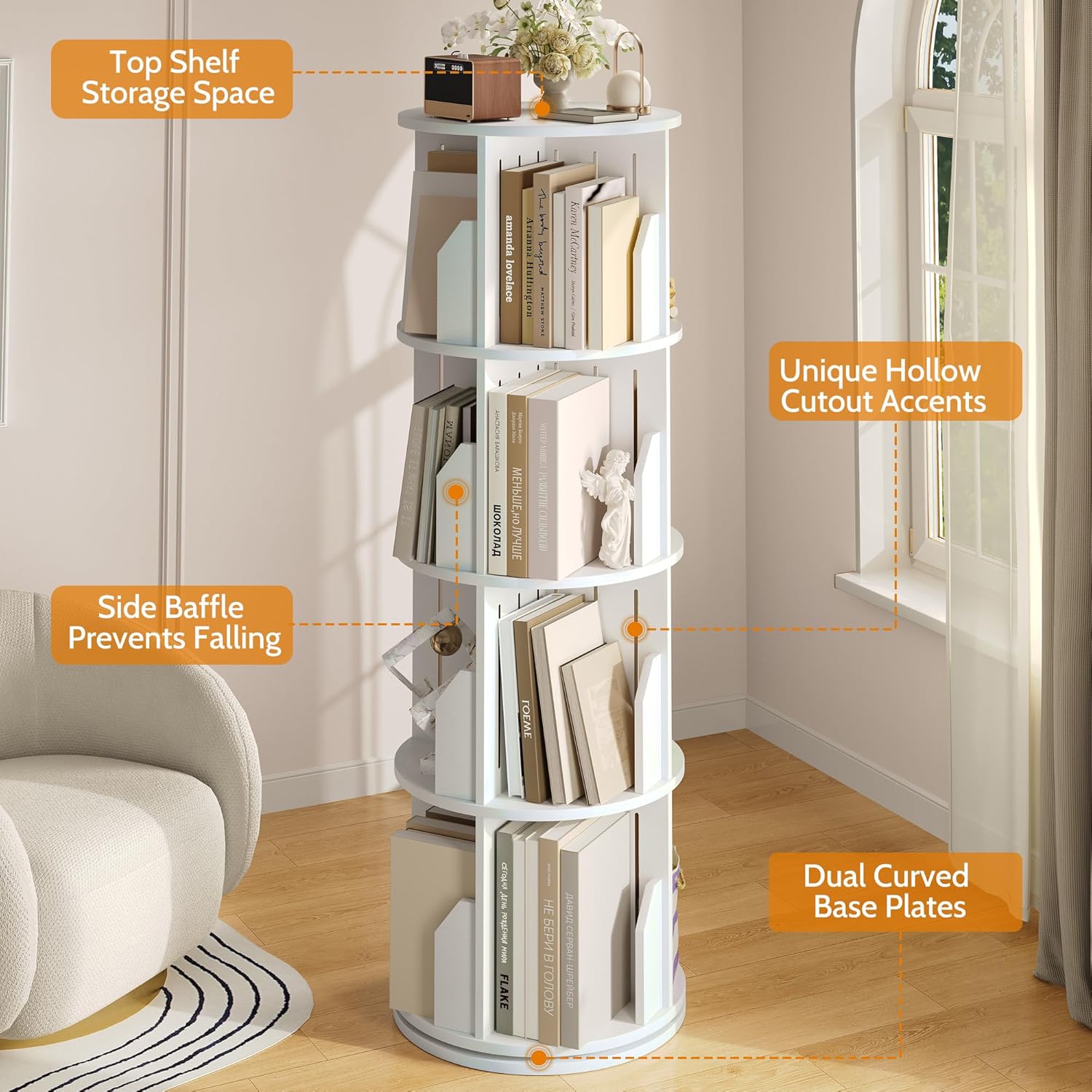 [Stunning Style] Tired of dull, cookie-cutter shelves? This rotating bookshelf makes a bold statement with its crisp white finish and eye-catching hollow-out accents. The natural wood grain adds a subtle vintage charm, perfectly balancing modern flair with timeless appeal. Available in sleek white or black, it's as durable as it is beautiful—bringing refined style and personality to any room.