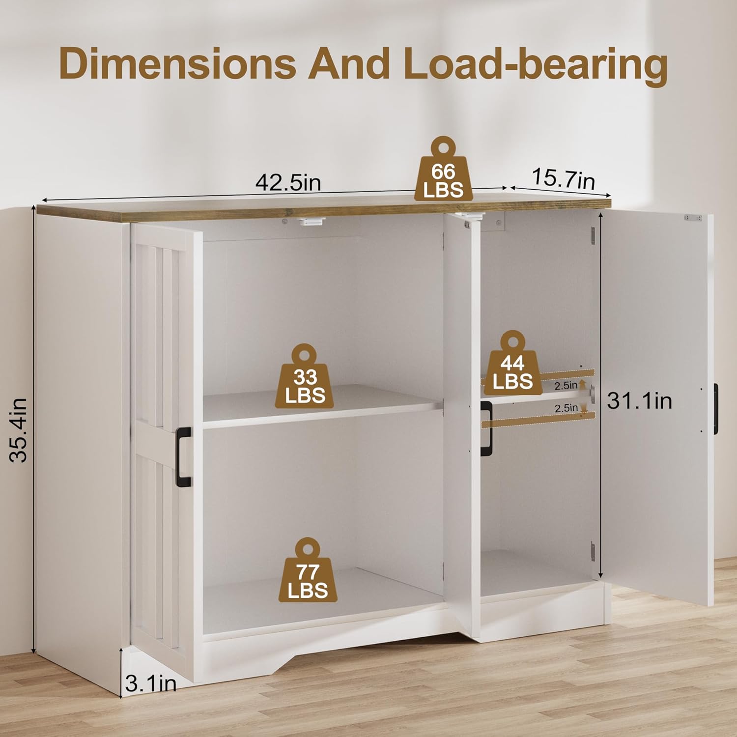 [Ample Storage Space] Designed with three doors, a spacious top, and two roomy bottom cabinets, this sideboard storage cabinet offers plenty of space to keep your essentials organized and your space clutter-free. The right cabinet features a 3-level adjustable shelf with a 2.5" height range, allowing you to customize the storage to fit your needs.
