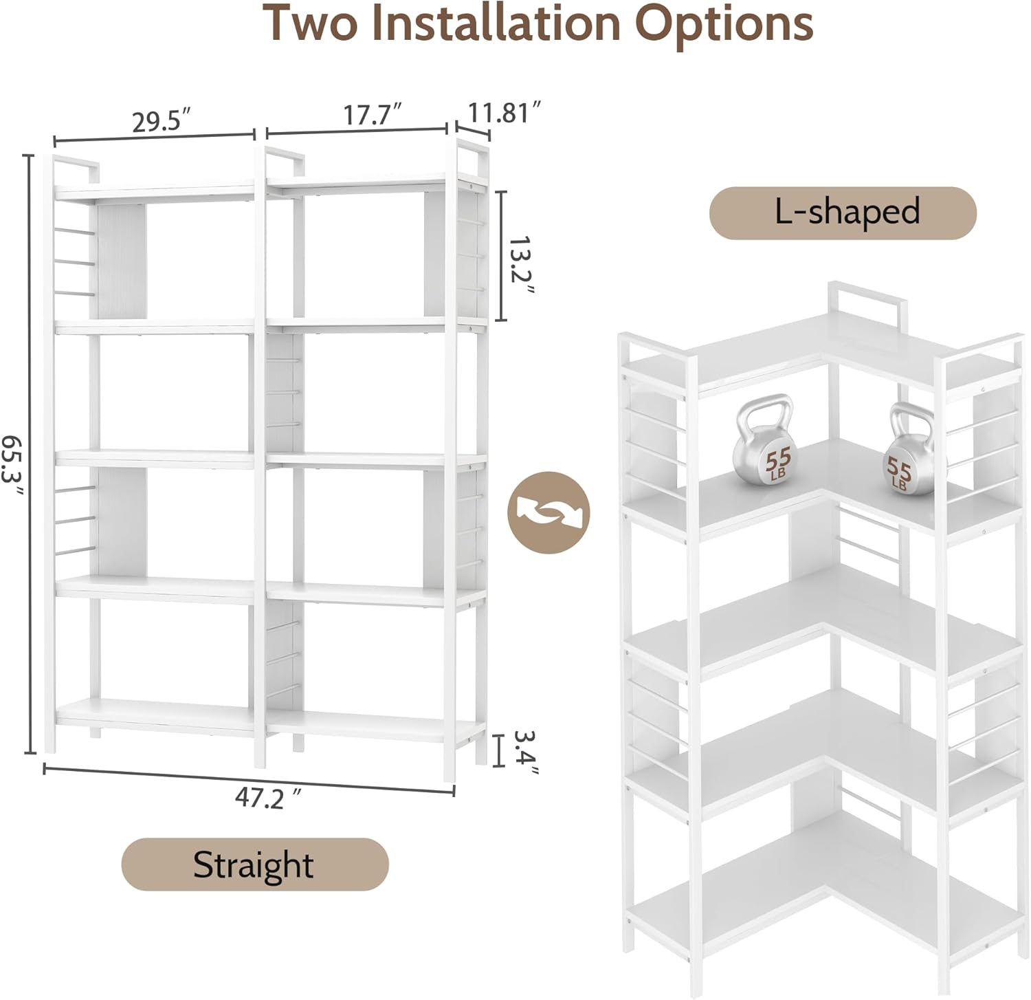 [Maximized Storage & Effortless Access] Featuring 5 roomy shelves and a total weight capacity of 550 lbs (110 lbs per tier), this reversible corner bookshelf is built to hold it all—books, décor, kitchenware, wine, clothing, and more. The open-shelf design keeps everything within easy reach while maintaining a clean, organized look. Whether you're displaying treasures or storing everyday essentials, this shelf offers both generous space and visual appeal to keep your room neat and stylish.