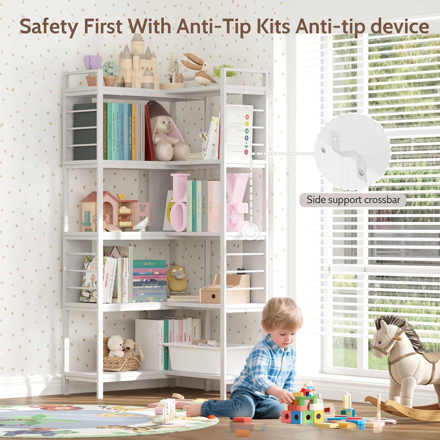 [Safe & Built to Last] Each tier features a side support bar and protective guard panel to keep books and items securely in place—no slipping, no surprises. Crafted with a heavy-duty steel frame and high-density E1-grade MDF, this display book shelf stand is designed for everyday durability. The included anti-tip kit adds an extra layer of stability, making it a safe and sturdy choice for families. Built tough for daily use, with safety you can count on.