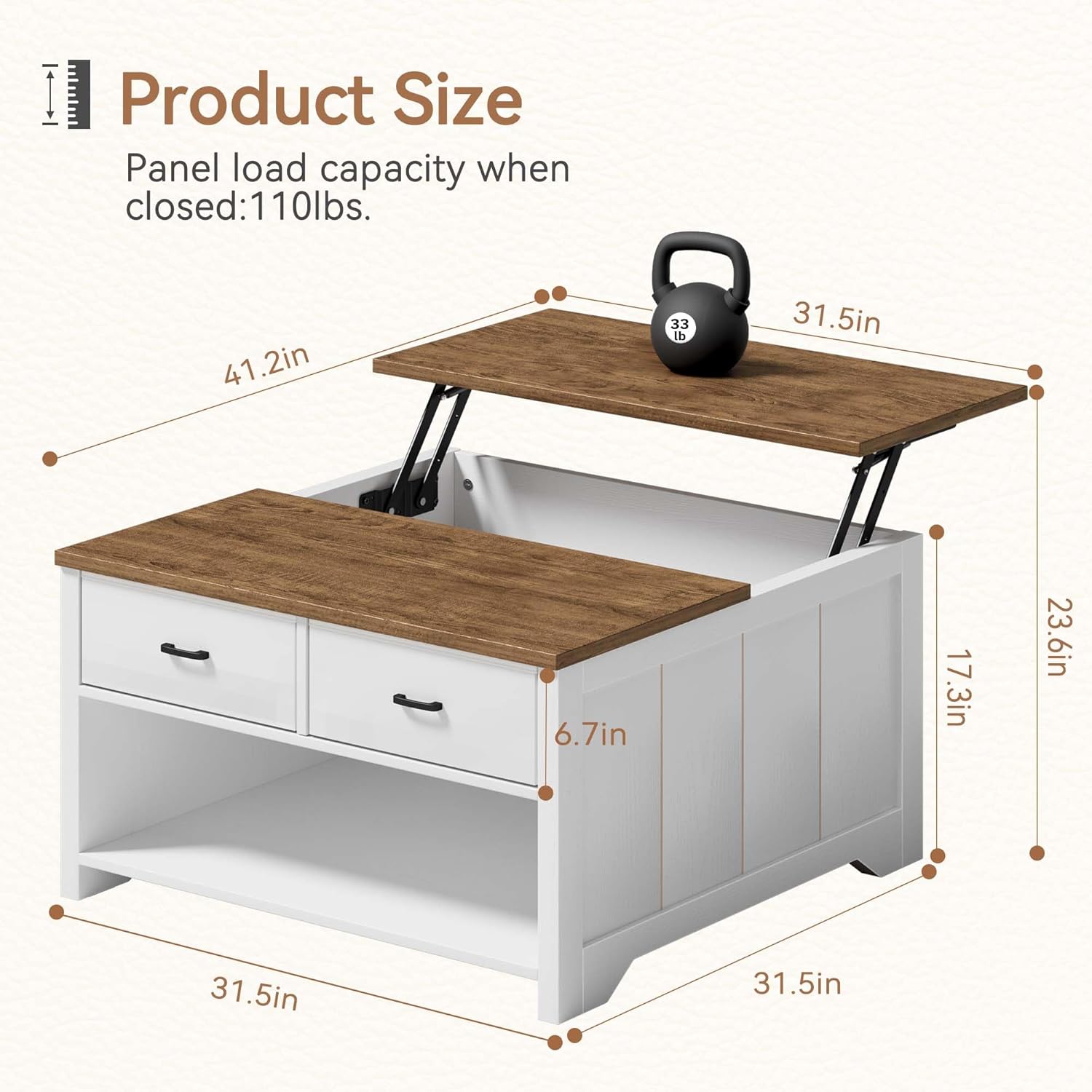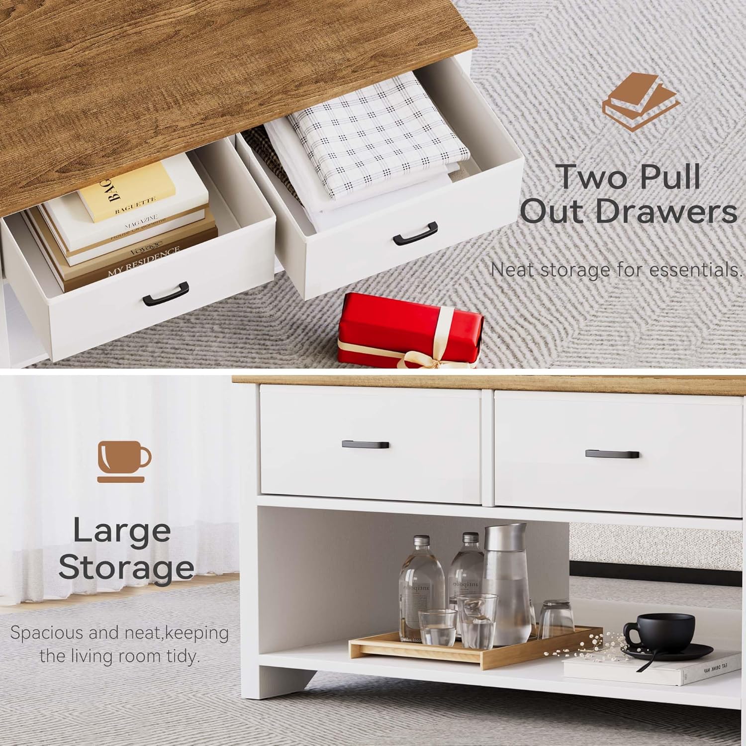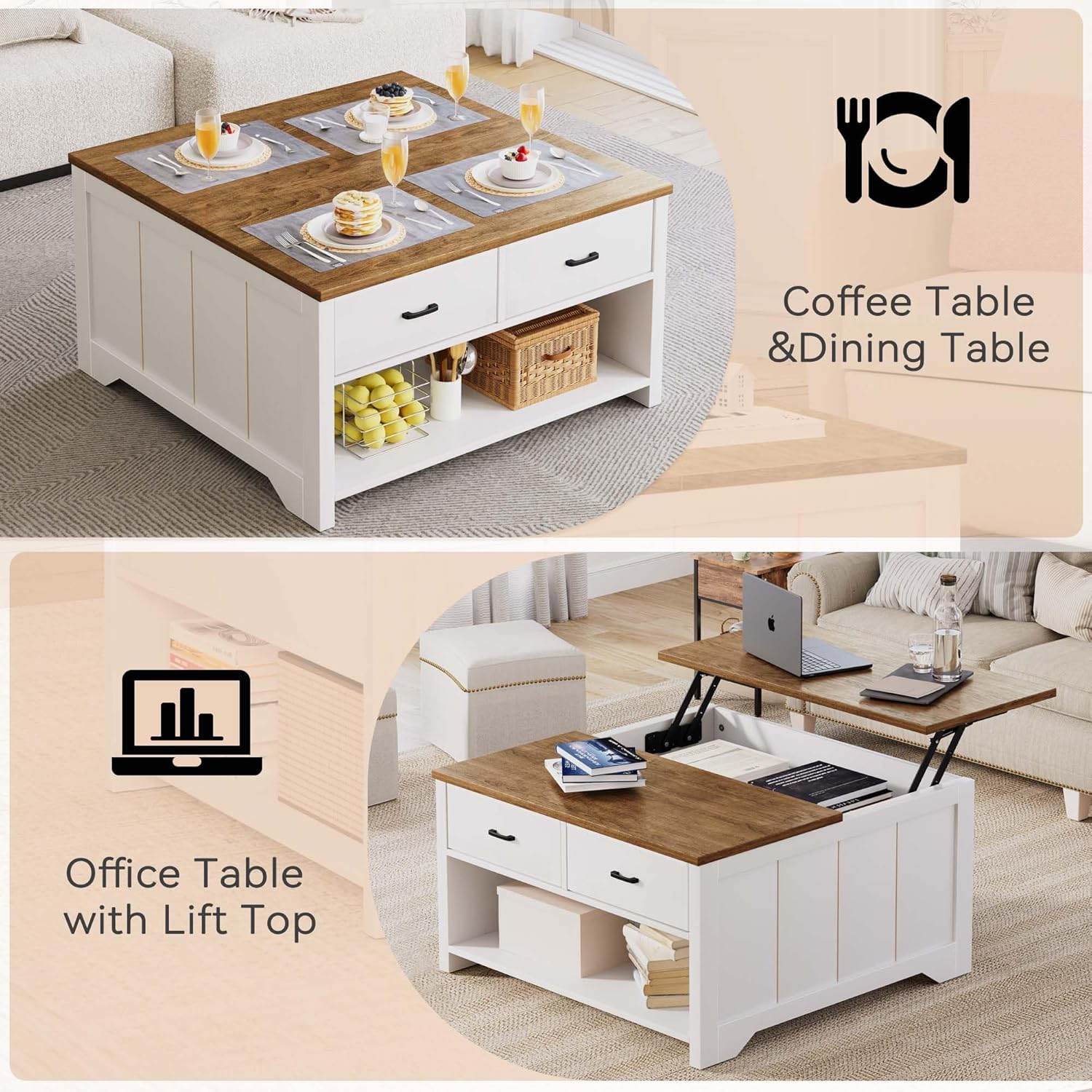 Vividwood Farmhouse Lift Top Coffee Table - Rustic Center Table with 2 Drawers & Large Storage (Brown)