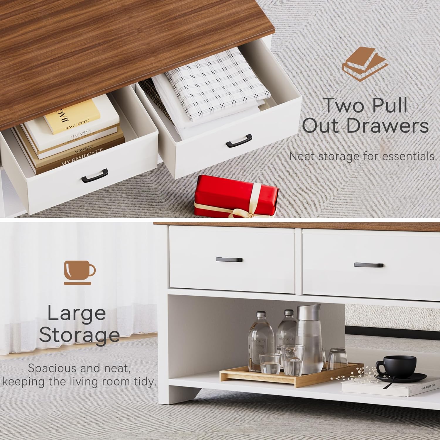 Smart Storage Solutions: Stay organized with a combination of concealed and open storage. The hidden compartment beneath the lift top is perfect for stashing pillows, blankets, and other living room essentials. Two spacious fabric drawers provide privacy for remote controls, chargers or personal items, while keeping things neat and tidy. The lower open shelf offers room for books, toys, décor, or everyday items you want within easy reach.